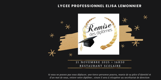 Le **vendredi 21 novembre 2025**, de **16 h 30 à 18 h 30**, le lycée **Elisa LEMONNIER** sera heureux d’accueillir les élèves diplômés de la session 2025 au restaurant scolaire pour sa traditionnelle cérémonie de remise des diplômes. La capacité d’accueil étant limitée, **seul le lauréat est attendu**.